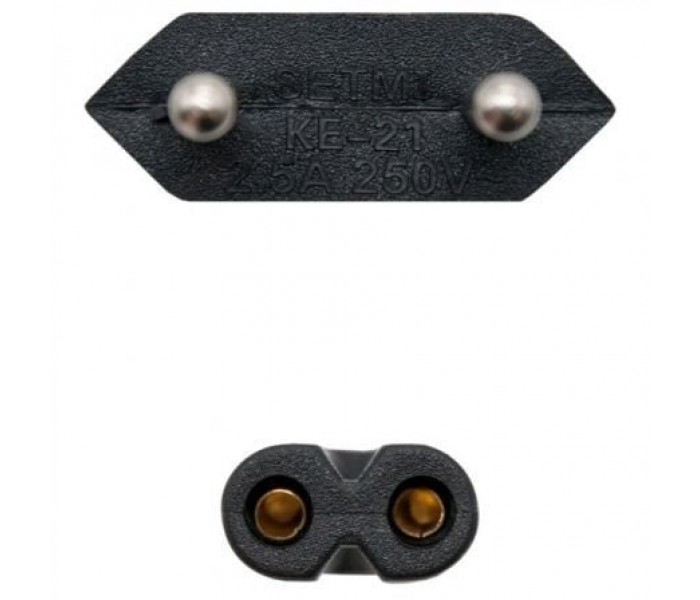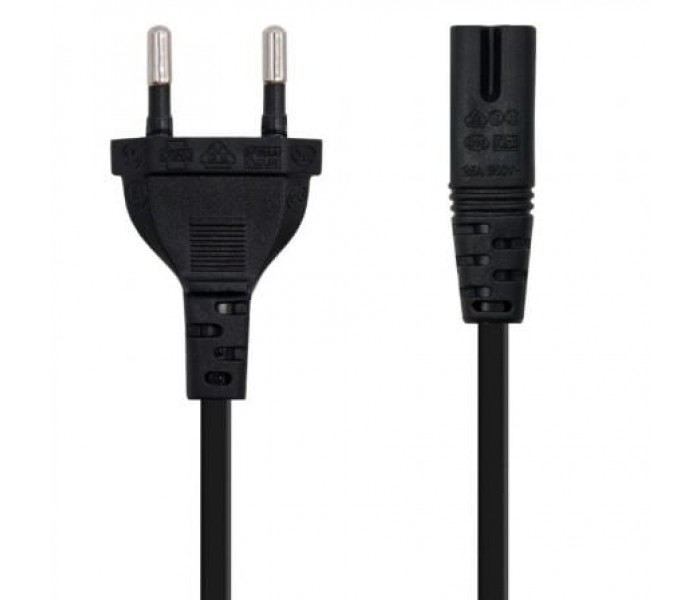 Cable de alimentación con forma 8 para cargar portátiles, equipos audiovisuales, consolas, y otros dispositivos electrónicos de baja potencia (consumo inferior a 1500W). Fabricado con conductor 100% cobre de AWG18.