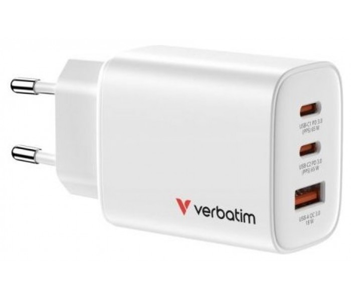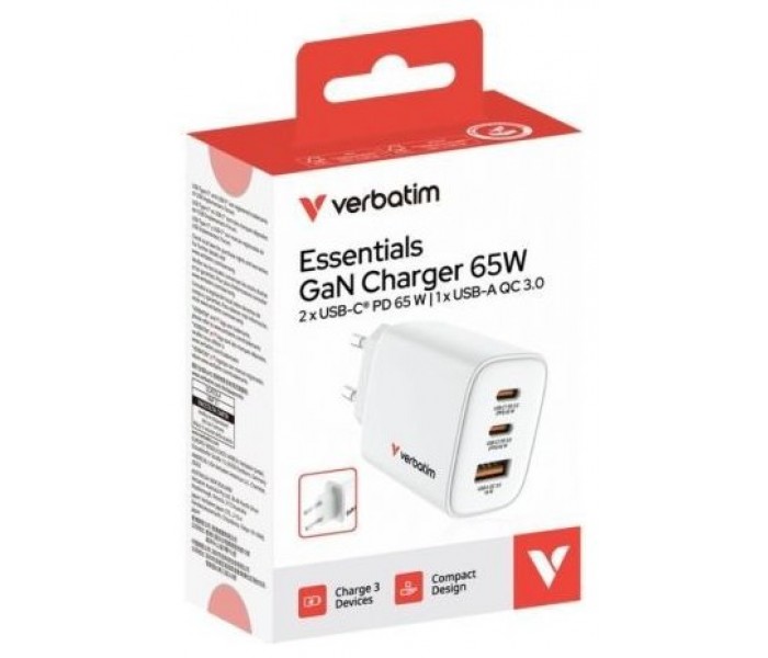 Carga de forma más inteligente y rápida con el cargador GaN Verbatim Essentials de 65 W: la solución de carga elegante y de alto rendimiento con tecnología GaN y compatibilidad con la carga simultánea de varios dispositivos.