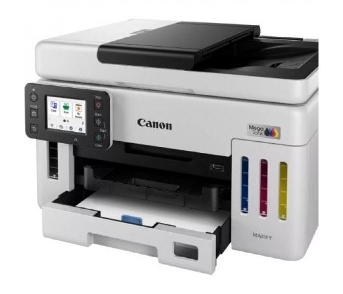 Resolución de impresión . Hasta 600 x 1200 ppp. . Márgenes de impresión (mín.) . Superior: 3 mm, inferior: 5 mm, izquierda y derecha: 3,4 mm . . Tecnología de impresión . 1 cabezal de impresión. Impresora con depósito de tinta rellenable . . Velocidad de impresión en blanco y negro . Aprox. 24 ipm. . Velocidad de impresión en color . Aprox. 15,5 ipm. . Tiempo de salida de la primera impresión . Blanco y negro: 5,5 s (lista) . Color: 7 s (lista)5 . . Impresión a dos caras . Impresión automática a doble cara [A4, Carta: papel normal (64 g/m²), Canon Red Label Superior (WOP111), papel Canon Oce Office Colour (SAT213)] . . Consumibles y rendimientos. . Botellas de tinta estándar . GI-56 BK. GI-56 C. GI-56 M. GI-56 Y. . Cartucho de mantenimiento . MC-G01 (sustituible por el usuario) . . Rendimiento de la botella (papel normal) . Impresión de documentos en color A46 . Negro: 6000 páginas (9000 páginas en el modo económico). Color: 14 000 páginas (21 000 páginas en el modo económico). * Rendimiento adicional estimado . . Compatibilidad de papel. Tipos de papel . Papel normal (64-105 g/m2) . Red Label Superior 80 g/m2 (WOP111), . Canon Oce Office Colour Paper 80 g/m2 (SAT213) . Papel fotográfico Pro Luster (LU-101), . Papel fotográfico Brillo II (PP-201) . Papel fotográfico Mate (MP-101), . Papel fotográfico Brillo de «uso diario» (GP-501) . Papel de alta resolución (HR-101N), . Sobre, . Papel fotográfico Plus Semi Brillante (SG-201), . Papel fotográfico adhesivo (RP-101) . Papel fotográfico magnético (MG-101) . Papel de transferencia térmica para tejidos claros (LF-101), . Papel mate de doble cara (MP-101D) . . Entrada máxima de papel . Bandeja posterior: máx. 100 hojas (papel normal) . Casete: máx. 250 hojas (papel normal) . ADF: A4, A5, LTR: 50 hojas, LGL: 10 hojas . . Tamaños del papel . Bandeja posterior: A4, A5, A6, B5, LTR, LGL, 4"" x 6"" (10 x 15 cm), 5"" x 7"" (13 x 18 cm), 7"" x 10"" (18 x 25 cm), 8"" x 10"" (20 x 25 cm), Cuadrado 5"" x 5"", (127 x 127 mm), Sobres (DL, COM10, C5), Tamaño personalizado (anchura: de 89 a 216 mm, longitud: de 127 a 1200 mm). Casete: A4, LTR, A5, B5. ADF: A4, A5, LTR, LGL. . Gramaje del papel . Bandeja posterior: papel normal: 64 g/m2 - 105 g/m2 o papel original de Canon compatible. Papel Canon: peso máx. aproximado de 265 g/m2. (Papel fotográfico brillo II [PP-201]). . Casete: papel normal, Canon Red Label Superior (WOP111), papel Canon Oce Office Colour (SAT213): 64-105 g/m2 . . Especificaciones del escáner. . Tipo de escáner . Escáner plano (ADF/Cristal de copia) y color CIS . . Velocidad de escaneo . Una cara. 16,9 ipm en color. Una cara. 22,1 ipm en blanco y negro . . Resolución del escáner (óptica) . 1200 x 1200 ppp . . Velocidad de escaneo por línea . Color: 1,4 ms/línea (300 ppp) . Escala de grises: 1,4 ms/línea (300 ppp) . . Profundidad de escaneo (entrada/salida) . Color: RGB cada 8 bits . Escala de grises: 8 bits . . Tamaño máximo del documento . Platina: A4/Carta (216 x 297 mm) . ADF: A4/Carta/Legal (216 x 356 mm) . . Especificaciones de la copiadora. Velocidad de copia . sFCOT/a una cara (color): aprox. 12 segundos . sESAT/a una cara (color): aprox. 12,7 ipm. ADF ESAT/a una cara (color): aprox. 12,2 ipm. ADF ESAT/a una cara (negro): aprox. 22,2 ipm. . Calidad de copia . 3 niveles (económico, estándar, alto) . . Ajuste de intensidad . 9 niveles (ajuste automático disponible, copia AE) . . Copia múltiple . 99 copias (máx.) . . Funciones de copia . Copia de documentos, copia a doble cara, copia a doble cara manual con ADF, copia 2 en 1, copia 4 en 1, copia clasificada (solo ADF), copia con eliminación de bordes (solo superficie plana), copia de carné de identidad . . Copia con zoom . De 25 a 400 % . . Ajuste a página . De A5 a A4, de B5 a A4, de A4 a A5 y de A4 a B5 . . Especificaciones de fax. . Tipo de fax . Súper G3 / Color . . Interfaz. Tipo y tamaño de pantalla . LCD de 2,7""/6,9 cm (pantalla táctil, color) . . Idiomas de visualización . Posibilidad de seleccionar entre 33 idiomas: japonés, inglés (mm y pulg.), alemán, francés, italiano, español, portugués, neerlandés, danés, noruego, sueco, finlandés, ruso, ucraniano, polaco, checo, esloveno, húngaro, eslovaco, croata, rumano, búlgaro, turco, griego, estonio, letón, lituano, chino simplificado, coreano, chino tradicional, tailandés, indonesio, vietnamita . . Conectividad. LAN cableada . Protocolo de comunicación: SNMP/HTTP/TCP/IP (IPv4/IPv6). TLS 1.3/1.2/1.1/1.0. Estándares compatibles: IEEE802.3u (100BASE-TX) / IEEE802.3 (10BASE-T). Velocidad de transferencia: 10 Mbps/100 Mbps (conmutación automática). Seguridad: IEEE 802.1X (EAP-TLS/EAP-TTLS/PEAP). . LAN inalámbrica . Protocolo de comunicación: SNMP/ HTTP/TCP/IP (IPv4/IPv6). TLS 1.3/1.2/1.1/1.0. Estándares compatibles: IEEE802.11n/IEEE802.11g/IEEE802.11b/IEEE802.11a//IEEE802.11ac 1117. Ancho de banda de frecuencia: 2,4 GHz/5 GHz. Alcance: Interior 50 m ;según las condiciones y la velocidad de transmisión. Seguridad: WPA-PSK (AES). WPA2-PSK (AES). WPA3-SAE (AES). WPA-EAP (AES)*. WPA2-EAP (AES)*. WPA3-EAP (AES)*. *IEEE802.1X (EAP-TLS/EAP-TTLS/PEAP) disponible. . Interfaz . USB de alta velocidad (puerto B) . . Aplicaciones móviles . Aplicación Canon PRINT Inkjet/SELPHY. Aplicación Easy-PhotoPrint Editor. . Funciones de impresora. Cloud Link (imprimir). Complemento Canon Print Service (Android). Apple AirPrint. Wireless Direct. Mopria (Android). Asistente inteligente y ayuda de automatización. Amazon Alexa™. . Software. Sistemas operativos compatibles . Windows 11, Windows 10, Windows 8.1, Windows 7 SP1. Solo se garantiza el funcionamiento en un PC con el sistema operativo preinstalado.. El control de la impresora e IJ Printer Assistant Tool son compatibles con los siguientes sistemas operativos: Windows Server 2008 R2 SP1, Windows Server 2012 R2, Windows Server 2016, Windows Server 2019, Windows Server 2022 y Windows Server 2025.. Entorno de pantall
