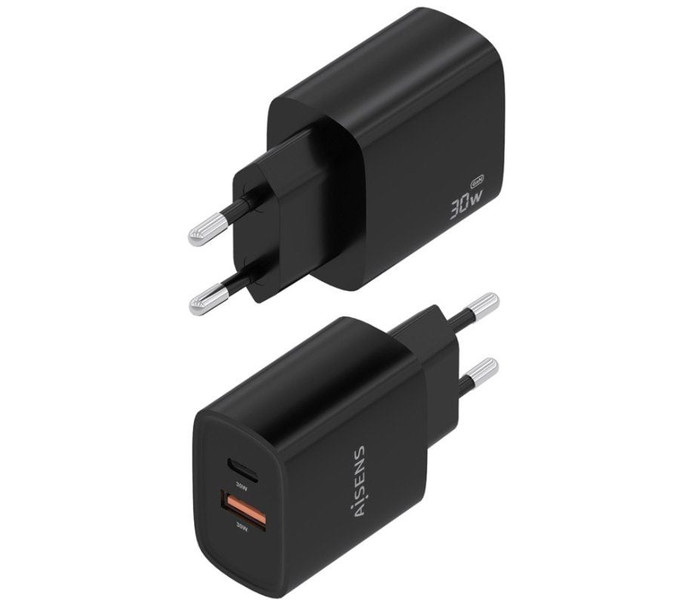 Cargador de Pared GaN Aisens A110-0953/ 1xUSB Tipo-C/ 1xUSB/ 30W/ Negro