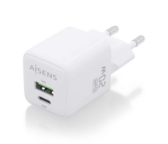 Cargador de Pared GaN Aisens ASCH-20W2P010-W/ 1xUSB Tipo-C/ 1xUSB/ 20W