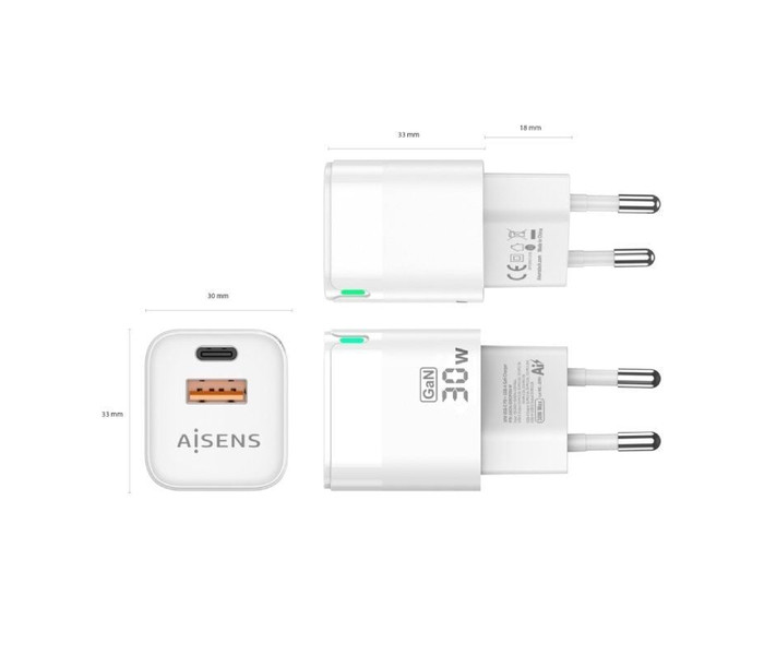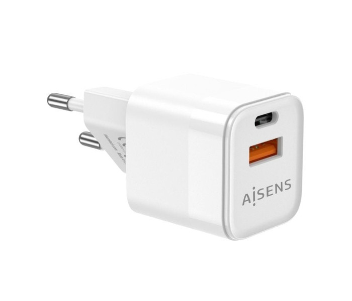 Cargador de Pared GaN Aisens ASCH-30W2P004-W/ 1xUSB Tipo-C/ 1xUSB/ 30W