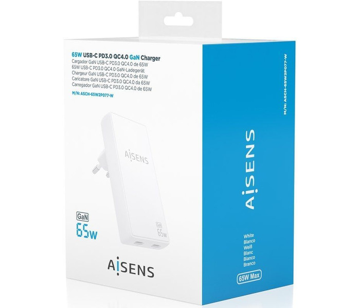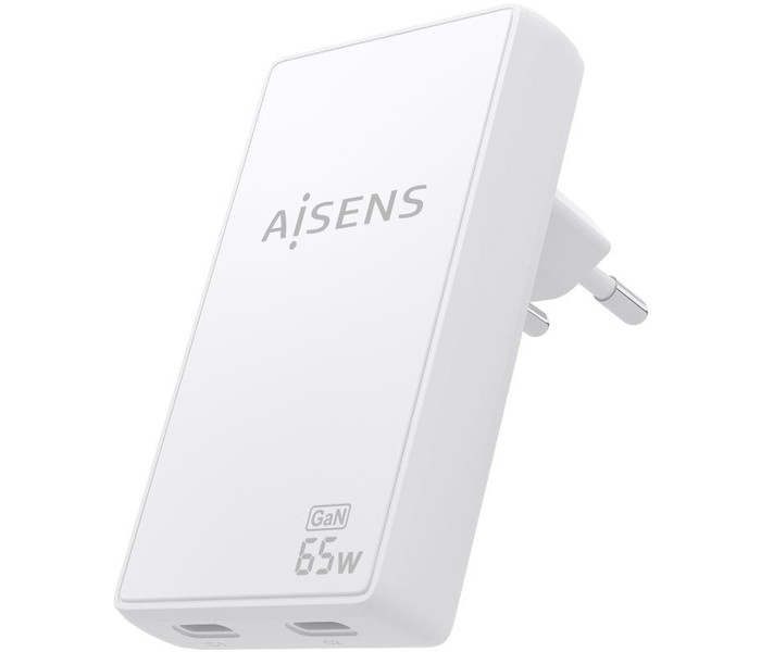 AISENS - CARGADOR DE PARED GaN ULTRA DELGADO 65W, 2xUSB-C PD3.0 QC4.0, BLANCO