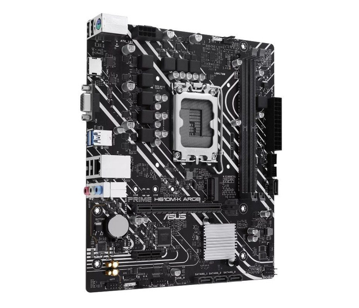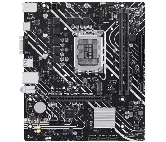 ASUS PRIME H610M-K ARGB. Fabricante de procesador: Intel, Socket de procesador: LGA 1700, Procesador compatible: Intel® Celeron®, Intel® Core™ i3, Intel® Core™ i5, Intel® Core™ i7, Intel® Core™ i9,.... tipos de memoria compatibles: DDR5-SDRAM, Memoria interna máxima: 96 GB, Tipo de ranuras de memoria: DIMM. Interfaces de disco de almacenamiento soportados: M.2, SATA, Tipos de unidades de almacenamiento admitidas: HDD & SSD. Tipo de interfaz ethernet: Gigabit Ethernet. Componente para: PC, Factor de forma: micro ATX, Familia del chipset: Intel
