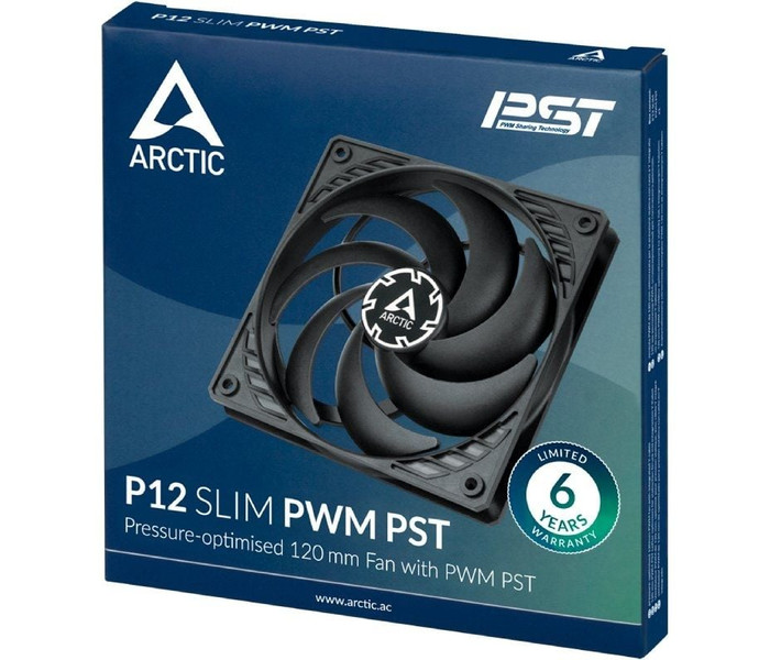 Con un amplio rango de velocidad y la innovadora tecnología PWM Sharing (PST), la velocidad del ventilador del P12 Slim PWM PST se puede controlar en sincronía con la de otros ventiladores. Los ventiladores PST de ARCTIC incorporan su propia solución de conexión en cadena y, además del conector, cuentan con otra toma para conectar uno o hasta cuatro ventiladores PST en serie.