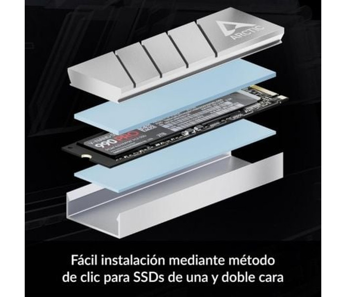 El montaje del ARCTIC M2 Pro no requiere tornillos ni gomas elásticas. En su lugar, el SSD se coloca entre los disipadores mediante un sistema de clic. El disipador NVMe para SSD está diseñado para SSD M.2 2280 de una y dos caras. Las diferencias de altura se compensan con la almohadilla térmica incluida.