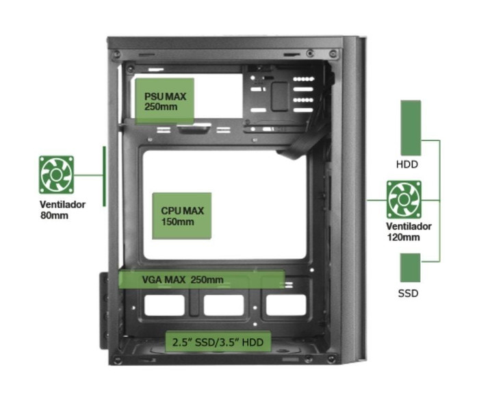 Características:. . Diseño. Caja de ordenador compacta Micro-ATX / Mini-ITX de alto rendimiento diseñada para ofrecer una estética minimalista y elegante, con una gran funcionalidad y una refrigeración sobresaliente. Cuenta con un frontal de con una malla completa de refrigeración y un acabado negro profesional que encaja perfectamente en contextos tanto domésticos como de oficina.. . Prestaciones. Dispone de una estructura totalmente optimizada y actualizada a las últimas tendencias para un montaje fácil y accesible ofreciendo, además, una total conectividad para tus periféricos. Dispone de multiples bahías internas para diferentes combinaciones de discos duros (2 x 2.5" SSD o 2 x 3.5" HDD).. . Conectividad. Cuenta con puerto USB 3.0, USB 2.0, micrófono y audio HD en el panel frontal que te permiten conectar tus periféricos con total comodidad.. . Refrigeración. Aparte de su rejilla frontal completa, cuenta con un amplio soporte para ventilación, permitiéndote instalar un ventilador frontal y otro lateral de 12cm, además de uno de 8 cm en la parte trasera.. Especificaciones:. Tipo: Caja Mini Torre. Placas: MicroATX / Mini-ITX. Estructura: Optimizada con múltiples bahías para un montaje fácil y accesible. Conectividad: USB3.0 x1 / USB2.0 x1 / HD Audio + Mic. Bahías: 2x 3.5"" HDD / 2x 2.5"" SSD. Ventilación: 1x 120mm frontal, 1x 120mm lateral, 1x trasero 80mm. Ranuras de expansión: 4. VGA: 250mm. CPU: 145mm. Dimensiones: 291x188x345