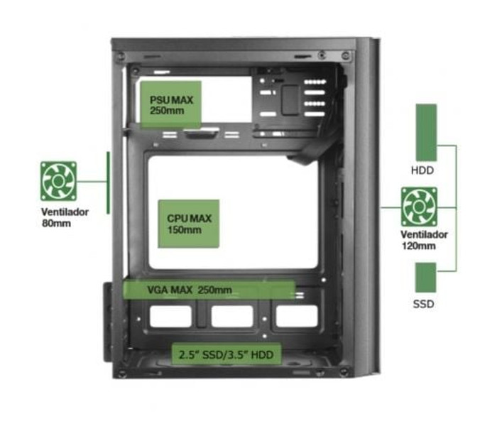 Características:. . Diseño. Caja de ordenador compacta Micro-ATX / Mini-ITX de alto rendimiento diseñada para ofrecer una estética minimalista y elegante, con una gran funcionalidad y una refrigeración sobresaliente. Cuenta con un frontal de con una malla completa de refrigeración y un acabado negro profesional que encaja perfectamente en contextos tanto domésticos como de oficina.. . Prestaciones. Dispone de una estructura totalmente optimizada y actualizada a las últimas tendencias para un montaje fácil y accesible ofreciendo, además, una total conectividad para tus periféricos. Dispone de multiples bahías internas para diferentes combinaciones de discos duros (2 x 2.5" SSD o 2 x 3.5" HDD).. . Conectividad. Cuenta con puerto USB 3.0, USB 2.0, micrófono y audio HD en el panel frontal que te permiten conectar tus periféricos con total comodidad.. . Refrigeración. Aparte de su rejilla frontal completa, cuenta con un amplio soporte para ventilación, permitiéndote instalar un ventilador frontal y otro lateral de 12cm, además de uno de 8 cm en la parte trasera.. . Fuente de alimentación de 500W. . Incluye una fuente de alimentación de última generación SMD de 500W equipada con un ventilador de 12cm ultrasilencioso de 14dB, con un sistema antivibraciones. Completamente negra y con cables negros para mantener una estética perfecta. Además, cuenta con una eficiencia energética estable del 85% y todas las protecciones de seguridad y las certificaciones europeas, garantizando el mejor rendimiento y estabilidad para tu PC.. Especificaciones:. Tipo: Caja Mini Torre. Placas: MicroATX / Mini-ITX. Estructura: Optimizada con múltiples bahías para un montaje fácil y accesible. Conectividad: USB3.0 x1 / USB2.0 x1 / HD Audio + Mic. Bahías: 2x 3.5"" HDD / 2x 2.5"" SSD. Ventilación: 1x 120mm frontal, 1x 120mm lateral, 1x trasero 80mm. Ranuras de expansión: 4. VGA: 250mm. CPU: 145mm. Fuente de alimentación: 500W ATX con ventilador de 12cm. Conectores: 1xATX 20+4pin/ 1x EPS 4+4pin/2x SATA/2x PATA. Dimensiones: 291x188x345