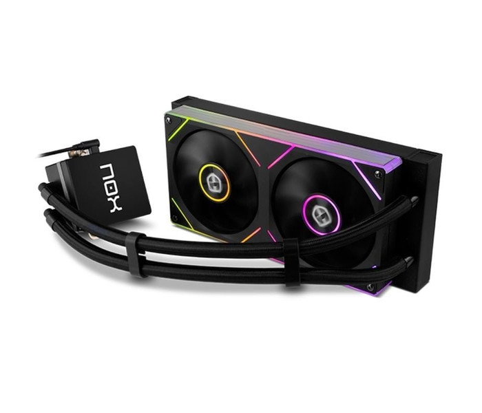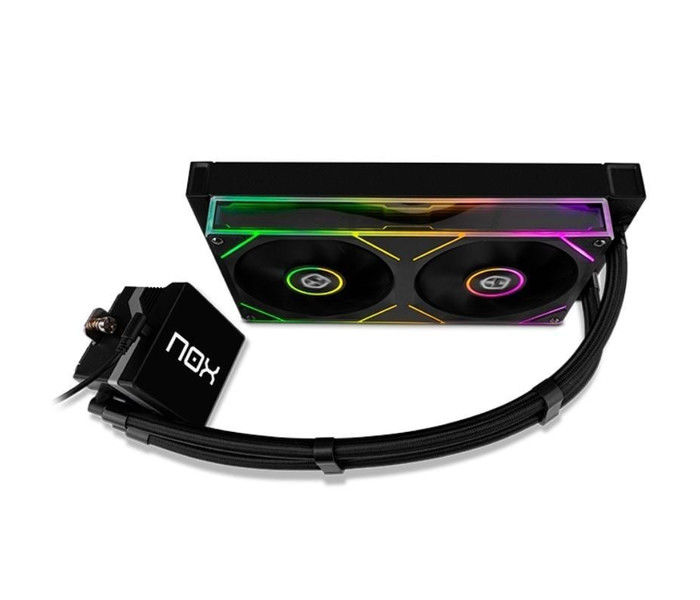 Disponible en color negro y blanco, este sistema de refrigeración líquida de Nox está compuesta por dos ventiladores con rodamiento hidraúlico, radiador de 240 mm y aletas aerodinámicas que facilitan la reducción de turbulencias entre radiador y ventilador.