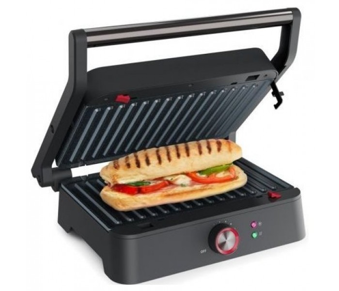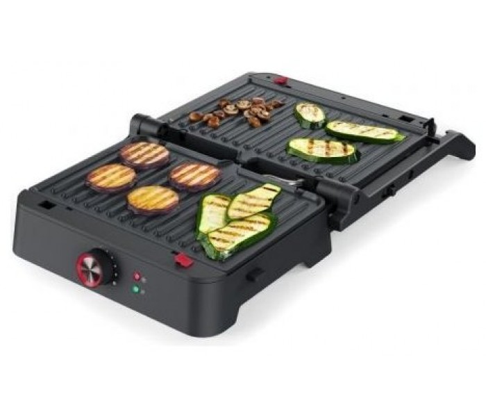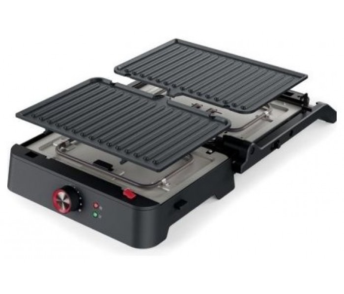 Tiene una superficie de cocción de 27,5 x 18 cm, termostato regulable y, gracias a su apertura de 180º, también puede utilizarse como parrilla de mesa. Al ser desmontables las placas, su limpieza después del uso es muy fácil. 1800 vatios de potencia.