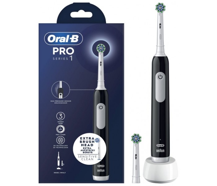 Oral-B Pro Series 1. Utilizar con: Adulto, Tipo de cepillo de dientes: Cepillo de dientes oscilante, Color del producto: Negro, Blanco. Fuente de energía: Batería, Tipo de batería: Batería integrada. Tipo de embalaje: Envase para colgar. Número de empuñaduras incluidas: 1 pieza(s), Número de cabezales incluido: 2 pieza(s)
