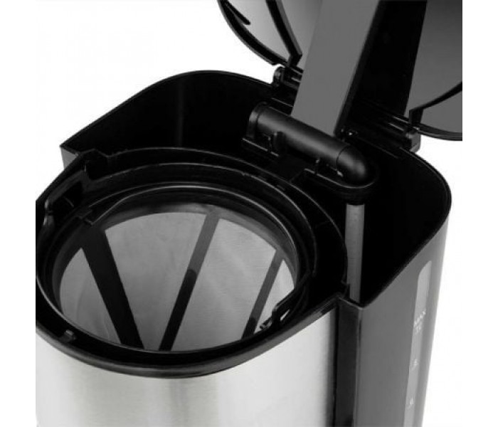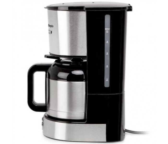 Tiene capacidad para 12 tazas y un depósito con indicador de nivel de agua, para lograr las medidas justas que proporcionen un delicioso café. Durante horas esta exquisita bebida se mantendrá caliente gracias a la jarra termo con doble capa de acero inoxidable con la que viene equipada. Cuenta con indicador luminoso de funcionamiento, una placa calórica antiadherente útil para preservar el calor y función de apagado automático.
