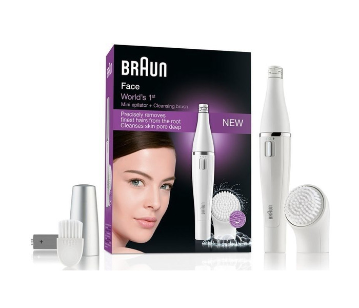 El dispositivo Braun Face te permite disfrutar de dos tratamientos con un solo aparato: solo tendrás que cambiar los accesorios. Depílate el vello facial con la depiladora y limpia los poros en profundidad con el cepillo de limpieza facial. 100 % resistente al agua para que puedas usarlo durante el baño o la ducha. Incluye 2 pilas AA adicionales para una limpieza y depilación facial extra.