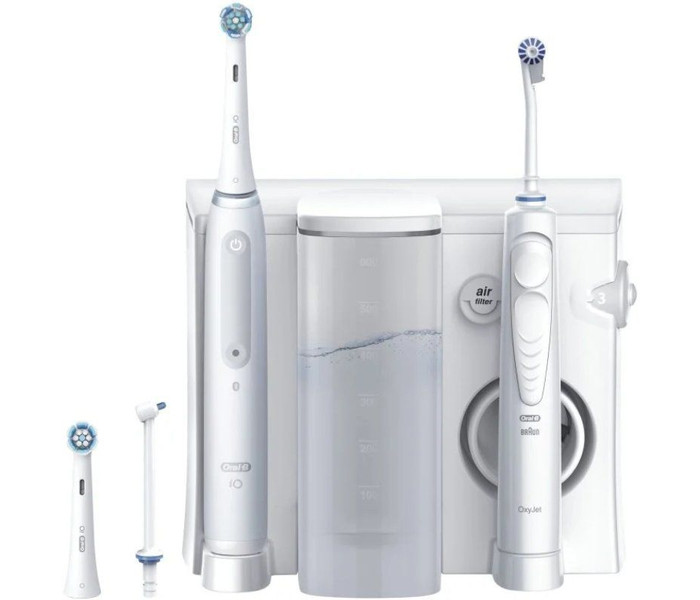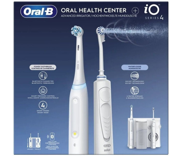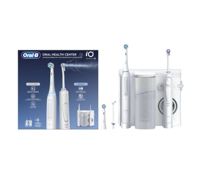 Gestión precisa y cómoda. Con su selector de 4 tipos de chorros, este irrigador agiliza y especializa el tratamiento de zonas interdentales, implantes y ortodoncia, ofreciendo una sensación de higiene profesional en cada uso. El mango iO4 y el cepillo de dientes eléctrico incorporan tecnología 3D que oscila, rota y pulsa, eliminando hasta un 100% más de placa comparado con los cepillos convencionales.