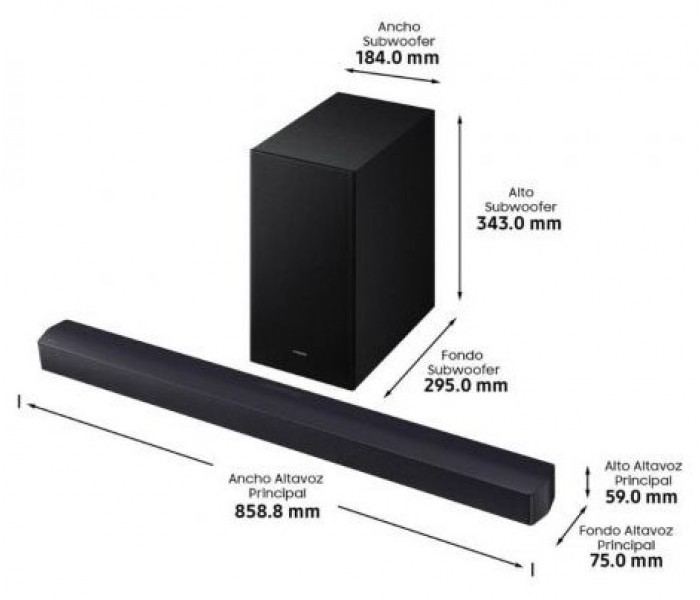 - Dimensiones barra de sonido: 858.8 × 59 × 75 mm