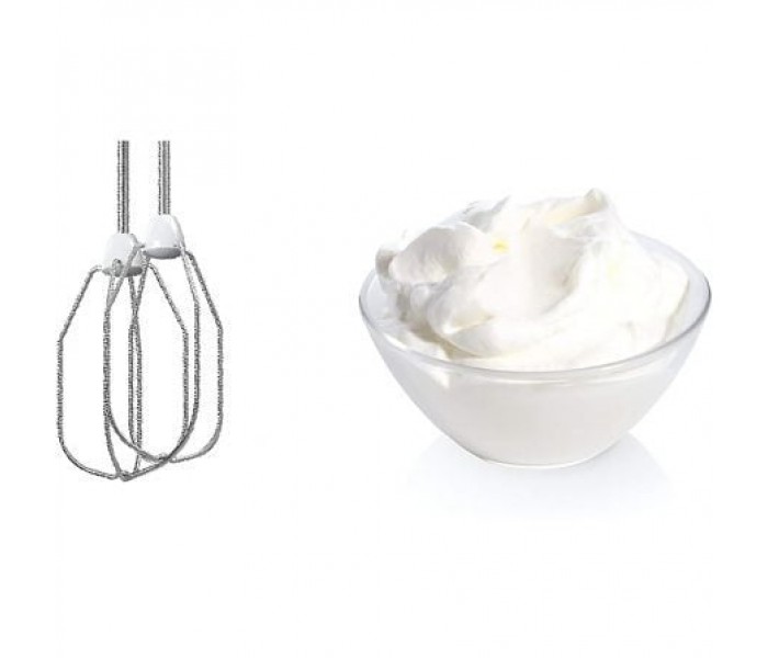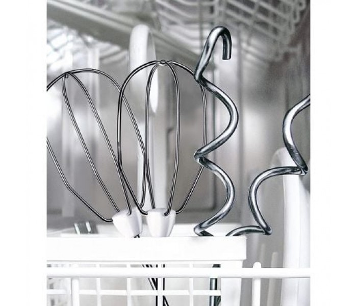 Equipada con dos varillas batidoras y dos garfios amasadores.