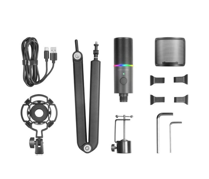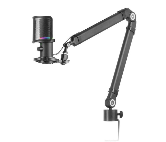 Da el salto profesional definitivo con el MMIC-XT. Un micrófono de estudio de alta definición (ADC 192 kHz) con iluminación DYNAMIC ARGB RING, brazo mecánico sólido y ajustable omnidireccional, soporte antivibración, filtro antipop de malla metálica y entrada Jack de auriculares sin latencia. Conexión USB plug & play y construcción completamente de metal para una durabilidad extrema.. . Características principales:. . KNOB DE CONTROL INTELIGENTE. Personalización total gracias al knob de control inteligente que te permite elegir entre diferentes modos de audio y ajustar la ganancia del micrófono:. 1. CARDIOIDE: para un sonido claro y direccionalmente enfocado, perfecto para transmisiones, grabación de instrumentos y grabaciones de voz. 2. REDUCCIóN DE RUIDO: elimina activamente el ruido externo y las interferencias, proporcionando una grabación limpia y nítida. 3. MODO MUTE: silencia el micrófono de forma rápida y visual gracias al indicador led inteligente. 4. GANANCIA DEL MICRóFONO : ajusta la sensibilidad del micrófono para capturar audio al nivel perfecto, asegurando que sus grabaciones sean nítidas y equilibradas. . BRAZO MECáNICO REGULABLE OMNIDIRECCIONAL. El brazo mecánico sólido premium ajustable permite un posicionamiento perfecto en cada circunstancia de grabación, brindando la flexibilidad necesaria para colocar el micrófono exactamente donde necesites.. . SOPORTE CON AMORTIGUADOR ANTIVIBRATORIO. Soporte con choque antivibración profesional para un aislamiento efectivo del micrófono del ruido y las vibraciones no deseados, lo que lo convierte en el accesorio indispensable para cualquier configuración de grabación profesional.. . FILTRO POP DE MALLA METáLICA. Reduce de manera efectiva la distorsión de los sonidos oclusivos y la sibilancia, lo que hace que el audio sea más natural y limpio gracias al filtro pop de malla metálica.. . TOMA DE AURICULARES SIN LATENCIA. Escucha tu voz o música a través del micrófono en tiempo real con sus auriculares conectados al puerto jack de 3,5 mm para un control máximo.. . ILUMINACIóN DYNAMIC ARGB RING. Experimenta la impresionante iluminación Dynamic ARGB RING con efectos visuales personalizables que se pueden controlar fácilmente con el sensor táctil. Agrega un toque de estilo a tus streamings o grabaciones para que sean mucho más atractivas. . MATERIALES PROFESIONALES. Micrófono y soporte totalmente metálicos construidos con los mejores materiales para una máxima durabilidad y estabilidad para mantener el micrófono seguro.. . Especificaciones:. . Diagrama polar: Cardioide y Omnidireccional. SPL: 120dB. Sensibilidad: -35dB±3dB. Rango de frecuencias: 20Hz-20kHz. Conector: USB (Micrófono) / Jack 3.5mm (Auriculares). Longitud del cable: 200cm. Iluminación: Indicador LED de estado y 8 modos de iluminación RGB Chroma. Impedancia: >;16Ω. Compatibilidad: Windows, Mac, PS4, PS5, *iPadOS, *Android (*adaptador OTG no incluido). Dimensiones: 165x65x50mm (micrófono) / 790x60x25mm (brazo)