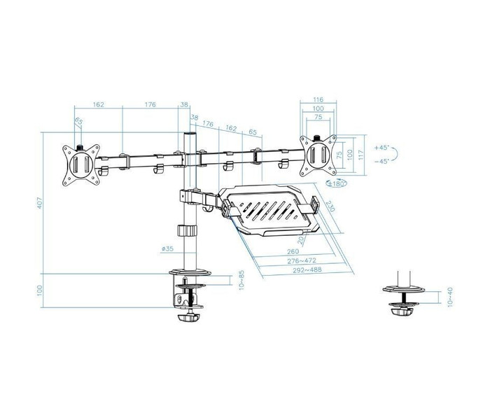 - La bandeja dispone de garras de ajuste de ancho con almohadillas de protección, se ajusta a una gran variedad de tamaños y formas