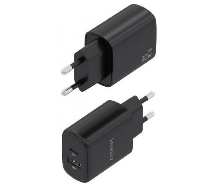 AISENS - CARGADOR GaN 30W, 1xUSB-C PD3.0 QC4.0, 1xUSB-A QC3.0, NEGRO