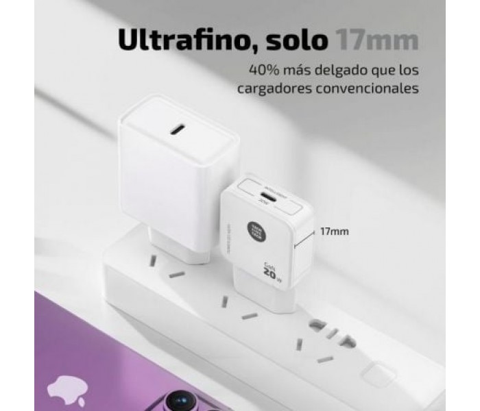 Cargador ultrarrápido GaN Power Delivery 3.0 (PD) 20W, color blanco.