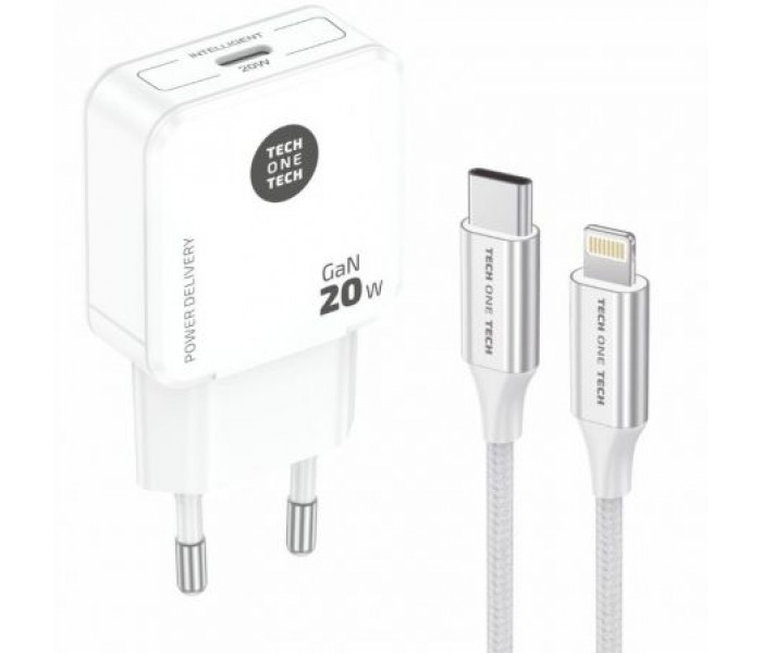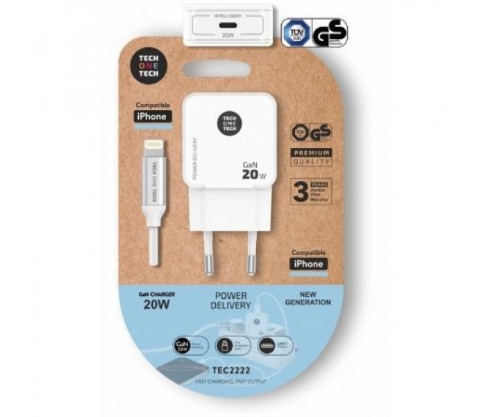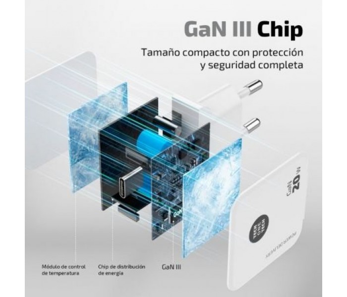 Cargador ultrarrápido con tecnología GaN Power Delivery 3.0 (PD) 20W, color blanco. Carga hasta un 400% más rápido que un cargador estándar de 5W. Compatible con dispositivos anteriores. Conector tipo Apple lightning de 3A. Este cargador permite cargar dispositivos como tabletas, móviles, consolas, baterías, auriculares, etc.