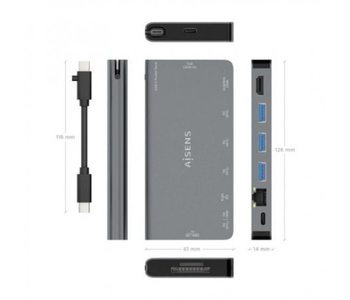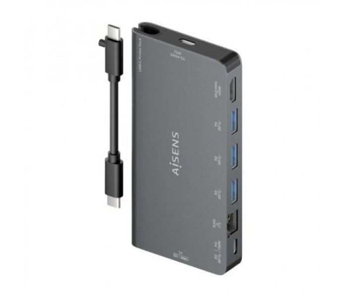- AISENS - USB-C DOCK 8 EN 1, USB-C A 1xHDMI, 1xRJ45, 3xUSB-A, 1xUSB-C DATOS+PD, 1xSD, 1xMICRO SD, GRIS, 10CM