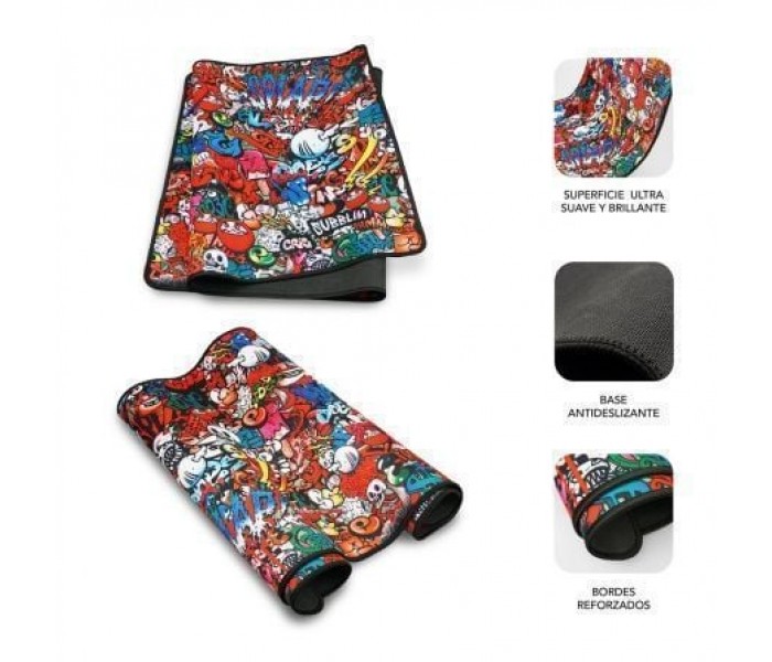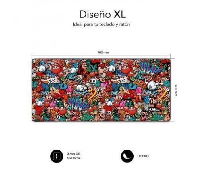 Magnificas dimensiones. Disfruta de sus 90 * 40 cm, 3 mm de espesor, no sólo para el ratón sino también para tu teclado. El diseño Graffiti está inspirado en la versión más urbana del público joven en la que dejan volar su imaginación y creatividad en los lugares más insospechados. Fabricada sobre caucho antideslizante que garantiza su durabilidad. El marco cosido permite que no se deshilache o se deshaga\n\nMarco anti-fray cosido\nLos bordes son reforzados por un proceso de costura que no solo supone un bonito detalle estético sino que también evita daños y deformaciones, aumenta considerablemente la vida útil y la estética de la alfombra.\n\nAntideslizante en la Base\nBase de goma antideslizante que resiste el deslizamiento incluso durante el uso más intenso. Mejora la experiencia de trabajo e incrementa la comodidad. Proceso avanzado multi-capa gran flexibilidad y anti-curling para evitar desplazamientos.\n\nSuperficie resistente al agua\nEl caucho de alta resistencia permite su limpieza con trapo húmedo. Mantén siempre limpio tu escritorio de una forma sencilla. El Mouse pad de puede enrollar para trasladarlo fácilmente y continuar usándolo.