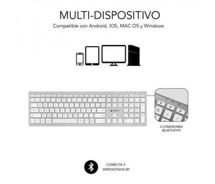 Especificaciones:. . Teclado completo ultra delgado con conectividad Bluetooth de última generación 5.1. Diseño ideal para espacios reducidos sin perder productividad gracias al teclado numérico incorporado. Compatible Android, IOS, MAC OS y Windows. Multi-dispositivo. Tablet, Smartphone, Laptop, Consolas o TV con conexión Bluetooth. Conecta hasta 3 dispositivos Bluetooth de forma sencilla. Teclado en Español con 110 teclas tipo Chiclet de alta precisión. Funcionamiento mediante Pilas (recomendamos el uso de Alcalinas)