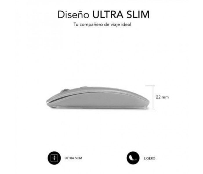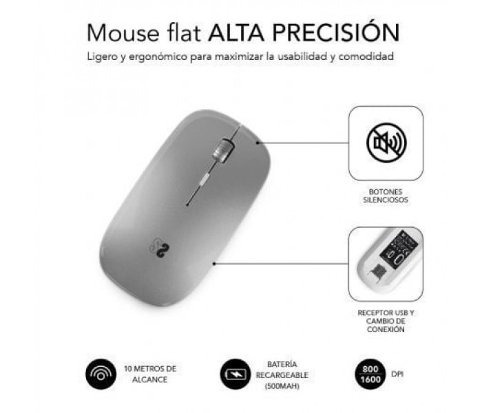 Este ratón es de los más completos del mercado. Es dual, lo que permite conectarlo a dos dispositivos usando la conexión bluetooth o el receptor USB de forma inmediata. Incluye la tecnología Silent Click para hacerlo silencioso y útil en entornos con otras personas. La batería está integrada y es de larga duración para interferir lo menos posible con tu ritmo de trabajo.Dos conexiones en un mismo ratón. Sin duda estamos ante uno de los ratones más completos del mercado. La tecnología dual permite que podamos conectarlo tanto por radiofrecuencia con un receptor USB como por bluetooth, pudiendo llegar a conectar dos dispositivos.Silent Click. El Dual Flat Mouse es silencioso para poder llevarlo a cualquier sitio, desde tu trabajo, un centro de estudio, tu casa. La tecnología Silent Click soluciona el molesto clic repetitivo del ratón que puede llegar a desconcentrarnos, los botones del ratón son silenciosos.Batería Li-ion Recargable. Sin necesidad de pilas, para que te puedas olvidar de ellas. Esta batería de 500 MHa es de larga duración. Además, nunca te quedarás sin ratón porque puedes seguir trabajando mientras se recarga la batería por USB.Rueda se silicona. Disfruta de las mejores sensaciones con la rueda antideslizante de diseño de silicona. Resulta muy cómoda y tiene un tacto agradable.Máxima precisión. Úsalo en múltiples superficies con alto rendimiento y excelentes resultados, adapta la precisión para trabajar a tu gusto. Cuenta con un sensor óptico con precisión láser de 1600 dpi que proporciona un movimiento suave y sin saltos.Ahorro de energía. Después de un tiempo de inactividad, el ratón pasará automáticamente al modo suspensión para ahorrar batería, así no tendrás que preocuparte por encenderlo o apagarlo cada vez que lo uses. Para activarlo, presiona cualquier tecla y vuelve al trabajo.