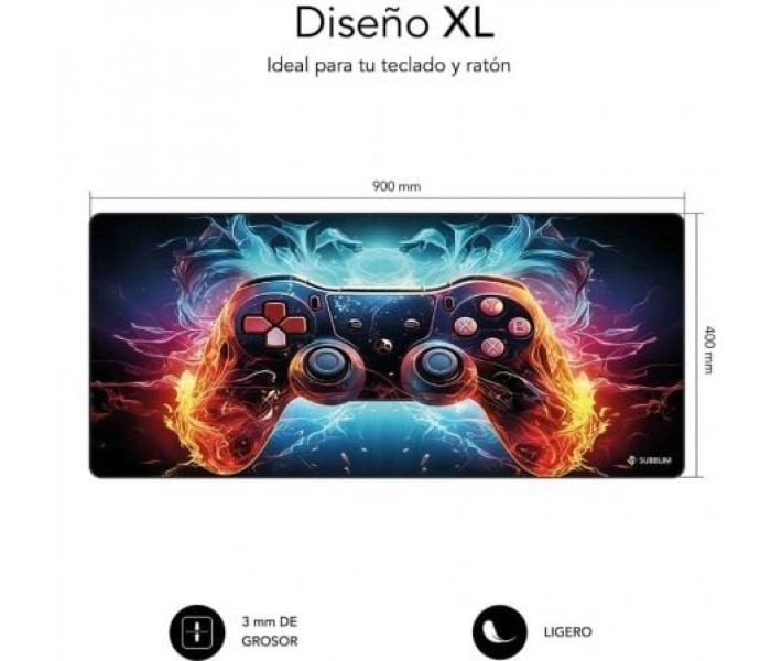 SUBBLIM GameCore XL Mouse Pad 900 × 400 × 3 mm ? Alfombrilla Gaming XXL con Base de Goma 85 % Antideslizante, Bordes Cosidos, Superficie Micro-Texturizada, Diseño Mando Fire-&-Ice, Impermeable y LavableDomina cada partida con la SUBBLIM GameCore XL Mouse Pad, la alfombrilla extra grande de 900 × 400 mm que integra teclado, ratón y accesorios sobre una única superficie continua, eliminando bordes que cortan el movimiento y favoreciendo una postura natural para muñeca y codo.La base de goma natural (85 %) antideslizante se agarra con firmeza a cualquier escritorio ?ya sea madera, cristal o metal? absorbiendo vibraciones y evitando desplazamientos involuntarios, pieza clave para la precisión extrema que exigen los e-sports y los flujos de trabajo creativos.Sobre ella descansa un tejido micro-texturizado uniforme que ofrece el equilibrio perfecto entre velocidad y control. Los sensores ópticos y láser de última generación encuentran aquí un tracking impecable, mientras la baja fricción reduce la fatiga en largas sesiones de juego, edición de vídeo o modelado 3D.Los bordes reforzados con costura de alta densidad sellan la tela contra el desgaste y eliminan el deshilachado. Con 3 mm de espesor, la alfombrilla proporciona una amortiguación cómoda que cuida muñeca y antebrazo sin sacrificar firmeza, prolongando su vida útil mucho más allá de la media.El factor diferencial es su estampado ?GameCore?: un mando retro de doble joystick rodeado de espectaculares efectos Fire-&-Ice ?lenguas de fuego naranja y ráfagas eléctricas azules? que plasman la energía del gaming moderno y transforman cualquier setup en un escenario épico, todo ello sin necesidad de LEDs ni cables gracias a una impresión HD resistente a rayones y lavados.Ligera y enrollable, cabe en tu mochila sin deformarse y recupera su forma al instante. Compatible con cualquier ratón, teclado o consola portátil, la GameCore XL es la aliada perfecta para gamers, streamers, creadores de contenido y profesionales que buscan espacio, confort y personalidad en su escritorio.Con la calidad garantizada SUBBLIM, la GameCore XL Mouse Pad es la inversión definitiva para mejorar tu rendimiento, proteger tu salud postural y exhibir tu pasión por el juego. ¡Haz clic en ?Añadir al carrito? y conquista la partida desde el primer movimiento!TAMAÑO XL 900 × 400 × 3?mmSuperficie continua que unifica teclado, ratón y periféricos. Elimina juntas molestas Mejora la ergonomía muñeca-codo Aporta estabilidad en maratones de juego o teletrabajoBASE DE GOMA NATURAL ANTIDESLIZANTE 85?%Textura wave-grip que se adhiere con firmeza a superficies de madera, vidrio o metal. Sin deslizamientos, vibraciones ni ruido incluso en ráfagas FPS o macros de edición intensivaTEJIDO MICRO-TEXTURIZADO HDCalibrado para sensores ópticos y láser hasta 26?000?DPI. Equilibra velocidad y control Ofrece seguimiento pixel-perfect Reduce la fatiga por fricción en recorridos prolongadosBORDES COSIDOS + NÚCLEO DE 3?mmSellado contra el deshilachado Evita ondulaciones con el tiempo Amortigua la presión sobre la muñeca Resiste más de 250?000 deslizamientos manteniendo la estéticaESTAMPADO 3DImpermeable, lavable y con colores indelebles que no se decoloran con el uso.