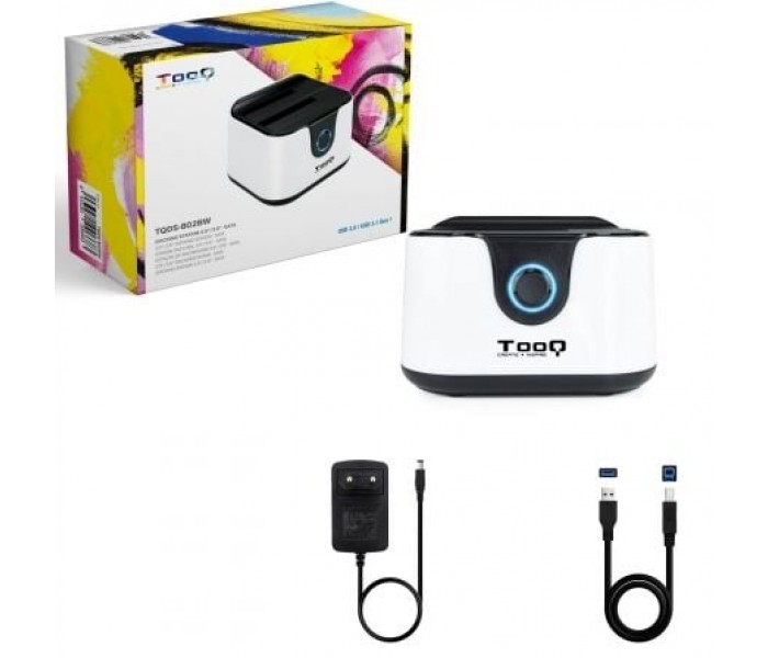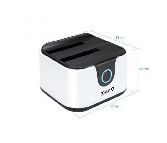 DOCK STATION DOBLE SATA 2.5/3.5 A USB 3.0, CLONE, OTB, NEGRO-BLANCO. Características destacadas, " Diseño sencillo y de muy fácil instalación, " Es una solución ideal para clonar discos duros y hacer copia de seguridad, " Puede clonar discos duros sin necesidad de un PC, " Puede hacer la copia de seguridad pulsando un solo botón, " USB host incorporados, " Versatilidad, es compatible con discos duros 2,5" y 3,5" SATA, Especificaciones, " Dock Station compatible con discos duros de 2,5" y 3,5" SATA I/II/III, " Conexión USB 3.0, " Velocidad de transferencia de hasta 5.0Gbps, " Capacidad máxima de HDD soportada: 3.0 TB, " Velocidad de HDD soportada: 4200RPM / 5400RPM / 7200RPM, " Tipo de formatos soportados: FAT32 / NTFS / eXT2 / HFS, " Sistemas operativos soportados: Windows 98 (requiere descarga de los controladores en www.tooq.es) / 2000 / XP / VISTA / Win7 y MAC OS 9.X o superior y sistemas Linux y Ubuntu, " Soporta copia de seguridad pulsando un solo botón (requiere sistemas operativos Win2000 / XP / VISTA / WIN 7 o superior), " Soporta clonación de discos duros sin necesidad de un PC, " Indicadores LED de encendido y funcionamiento, " USB 2.0 HOST incorporado, " Material: ABS, " Medidas: 130x120x85 mm, " Peso: 350grs, " Color: negro-blanco, Contenido, " Estación de docking de doble bahía, " Adaptador de corriente externo, " Cable USB 3.0 de 1,2m, " Manual de usuario, " CD de software, -