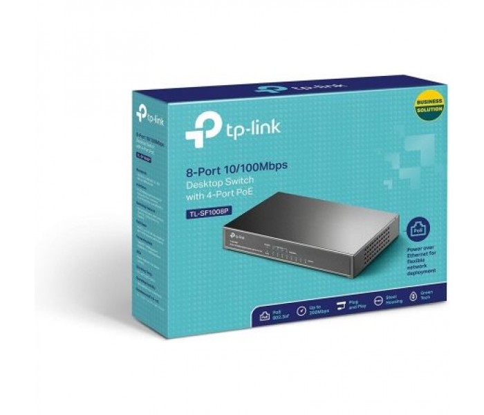 El TL-SF1008P es un switch no gestionable de 8 puertos 10 / 100Mbps que no requiere configuración y ofrece 4 puertos PoE (Alimentación sobre Ethernet). Puede detectar automáticamente y suministrar energía a todos los dispositivos de potencia (PDs) que cumplan con IEEE 802.3af. En esta situación, la energía eléctrica se transmite junto con los datos en un único cable que le permite ampliar su red hacia donde no hay enchufes, donde desea fijar los dispositivos tales como puntos de acceso, cámaras IP, teléfonos IP, etc.