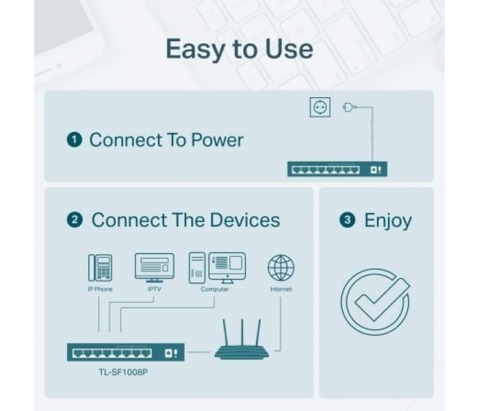 El TL-SF1008P es fácil de instalar y utilizar No requiere ningún tipo de configuración o instalación. El switch PoE de sobremesa con 8 puertos 10/100 Mbps TL-SF1008P de TP-LINK ofrece un rendimiento y calidad excepcionales por lo que resulta una excelente opción para ampliar tanto su red doméstica como la de su oficina.