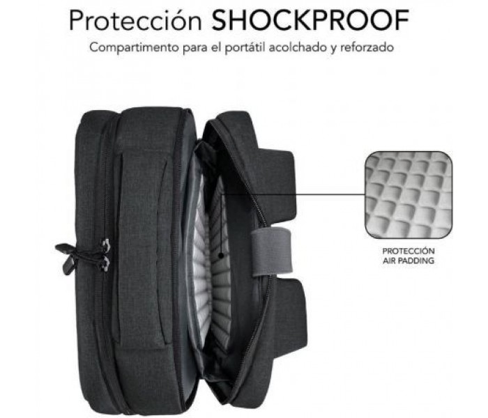 Especificaciones:. . Exclusiva, moderna y elegante mochila para portátiles de hasta 15,6". Gran departamento con espacio acolchado para el portátil con sistema AIR PADDING y doble cremallera de cierre que incluye un bolsillo específico para Tablet. Otro departamento te permitirá transportar y organizar todos tus accesorios o enseres personales, con bolsillo para botellas, llavero, documentos, bolígrafos…. Bolsillos frontal con cremallera para accesorios y documentos. Gran bolsillo frontal/lateral de fácil acceso. Correas de hombro ergonómicas, acolchadas y ajustables mediante cinta regulable. Asa de mano superior acolchada para un confortable transporte. Espalda reforzada mediante malla de ventilación para una mayor comodidad y que evita la sudoración. Sistema integrado de correa para Trolley. Puerto USB para carga de dispositivos. Medidas 41x29,5x14cm
