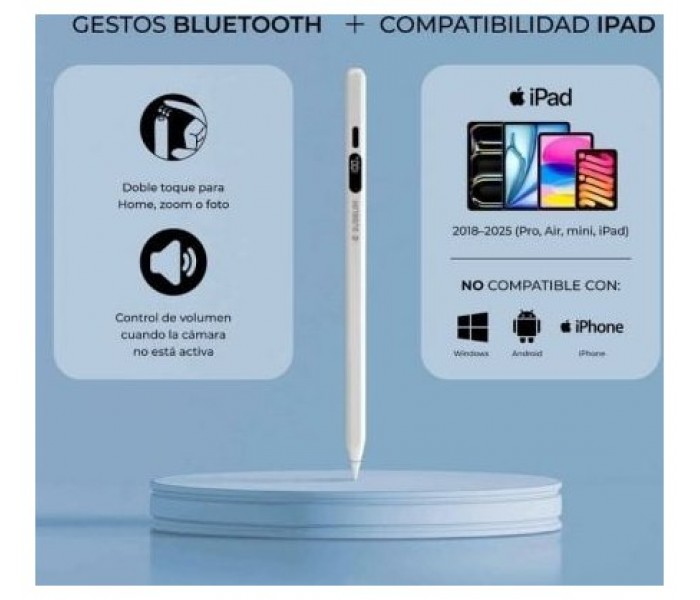 Escribe y dibuja como en papel en tu iPad. NoteFlow Pen for iPad combina Palm Rejection para apoyar la mano sin toques fantasma y sensibilidad a la inclinación para sombrear o variar el grosor con un gesto natural. La punta POM de 0,9 mm ofrece control fino y deslizamiento suave, incluye 2 repuestos para mantener siempre un trazo consistente. (Especificaciones según hoja de producto).Mantén el control del tiempo con su pantalla digital: muestra el % de batería, las horas de uso restantes y el modo de ahorro para evitar sorpresas en clase o reunión. Con hasta aprox. 10 h de autonomía por carga y USB-C con recarga ?30 min, el lápiz acompaña tu jornada sin atarte a un enchufe.Acelera tu flujo con gestos Bluetooth: doble toque para volver a Inicio, hacer zoom o tomar una foto, cuando no usas la cámara, los botones pueden controlar el volumen. Empareja en Ajustes > Bluetooth como ?Pencil?, solo la primera vez.Compatibilidad amplia: iPad Pro (incl. 2024 11"/13"), iPad Air 3?7 (incl. 6 11"/13"), iPad mini 5?7 e iPad 6?11. No compatible con iPhone, Android, Windows ni iPad anteriores a 2018.Incluye: NoteFlow Pen, cable USB-C, manual y 2 puntas. Especificaciones: batería Li-Po 130 mAh, entrada 5 V/200 mA, USB-C, temp. de trabajo 0?35 °C