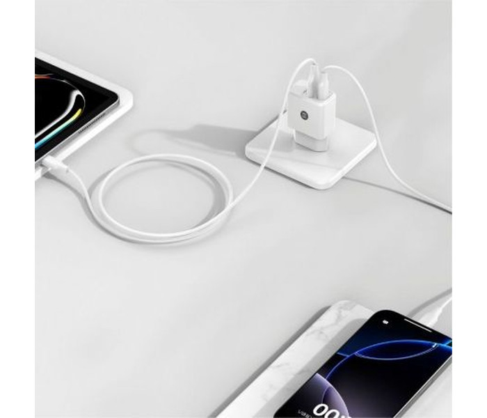 KIT compuesto por cargador rápido doble con entrada de 100-240V, dos salidas USB , USB-C + USB-A color blanco + cable de datos y carga rápida de 1 m. de longitud, con conector tipo USB-C , cable recubierto de Nylon trenzado y conectores metálicos para una mayor resistencia y durabilidad.