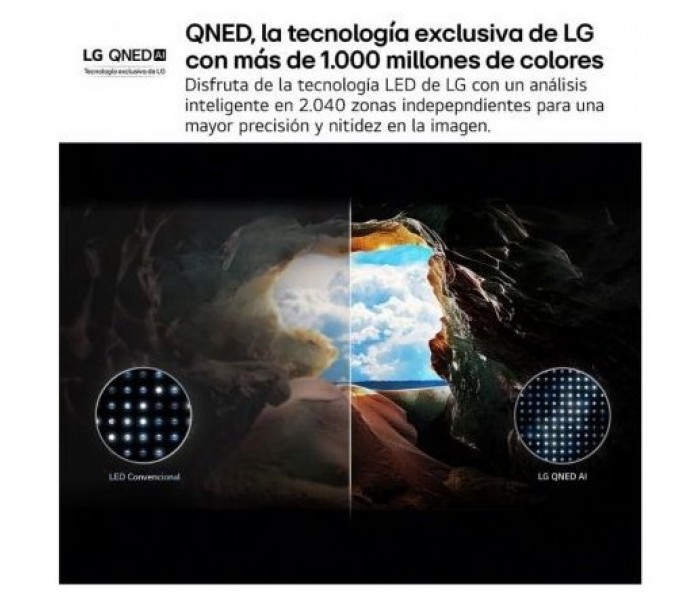 • Más de 1.000 millones de colores, ahora más intensos que nunca con LG QNED, la tecnología exclusiva de LG. Mayor contraste y brillo en la imagen, gracias al análisis inteligente de Dynamic Tone Mapping en 2.040 zonas independientes.
