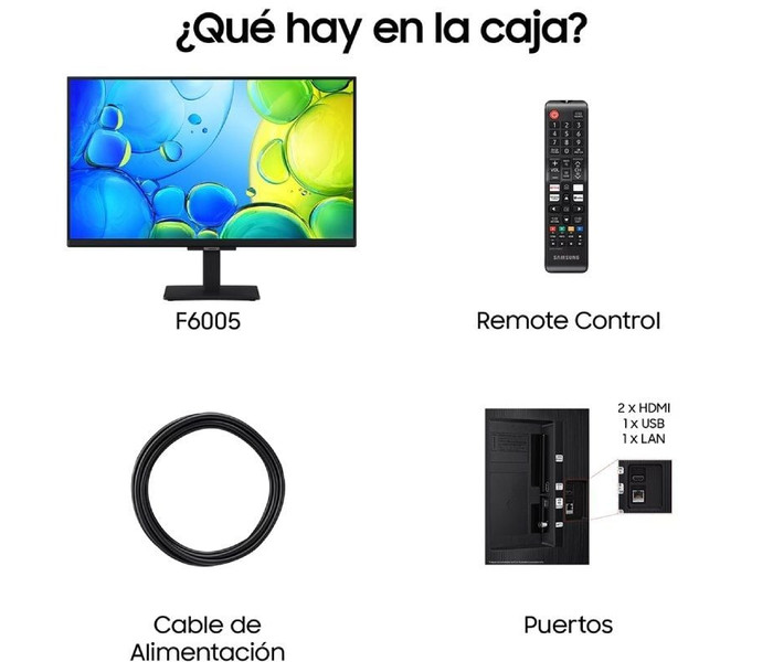 Samsung TU24F6005FK. Diagonal de la pantalla: 61 cm (24"), Resolución de la pantalla: 1920 x 1080 Pixeles, Tipo HD: Full HD, Tecnología de visualización: LED, Forma de la pantalla: Plana. Smart TV. Relación de aspecto nativa: 16:9. Formato de señal digital: DVB-C, DVB-T2. Wifi, Ethernet. Color del producto: Negro