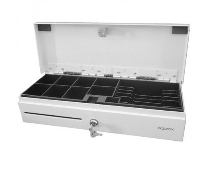 El APPCASH02FLIPTOPWH es un cajón portamonedas compacto perfecto para todo tipo de establecimientos y puntos de venta. Diseñado para una fácil instalación y uso, ofrece diferentes compartimentos para separar los billetes y monedas.. Se integra fácilmente con POS e impresoras compatibles a través de su conector RJ-11 Bandeja con funda protectora con asas y cerradura.. . . ESPECIFICACIONES TéCNICAS. . • 6 compartimentos de billetes.. • 8 compartimentos de monedas.. • Cerradura 2 posiciones.. • Apertura manual o electrónica.. • Contiene tapa porta bandeja con asa y cerradura. (Ideal para transportar la bandeja sin tenerse que llevar el cajón). • Conexión Rj-11 / RJ-12. • Rango de pulso: 100~200ms.. • Voltaje: DC12V/1A.. • Temperatura funcionamiento: -10 a 40ºC.. • Humedad relativa funcionamiento: 40 a 95%.. • Peso bruto: 5 Kg. • Tamaño: 460 mm de ancho x 170 mm de largo x 100mm de alto.. • Color: Blanco