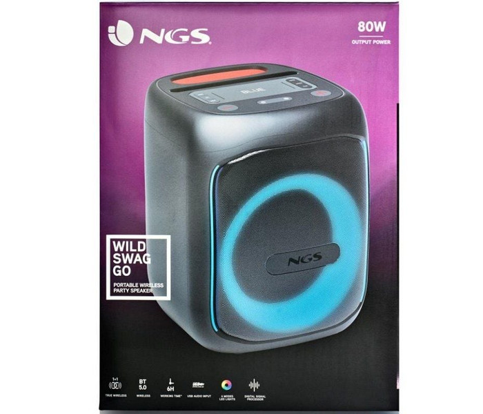 - Sus 80W de potencia y sus luces LED te permitirán montarte la fiesta allí donde vayas, y si aún quieres más, dobla el volumen conectando 2 NGS WILD SWAG GO de forma inalámbrica gracias a su función TWS.